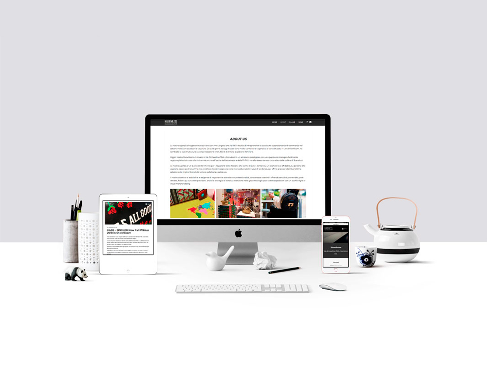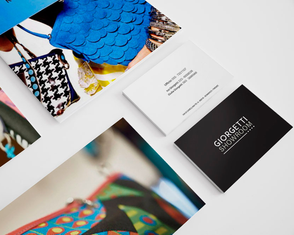 La progettazione grafica del biglietto da visita fronte – retro è uniforme alla linea grafica utilizzato per il logo. Ai fini di una maggiore visibilità del cliente è stato realizzato il sito web – www.giorgetti.it . Progettato con l’ausilio della piattaforma Css WordPress. Il sito tuttavia è concepito sia come una vetrina dei brand seguiti che blog delle ultime tendenze stilistiche